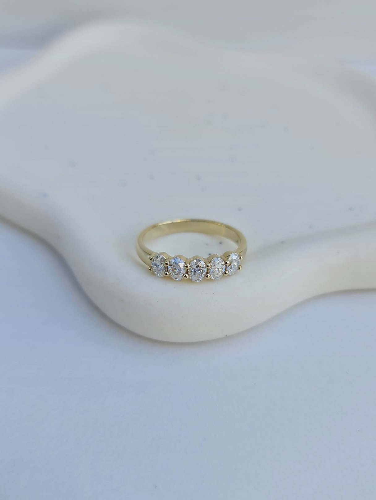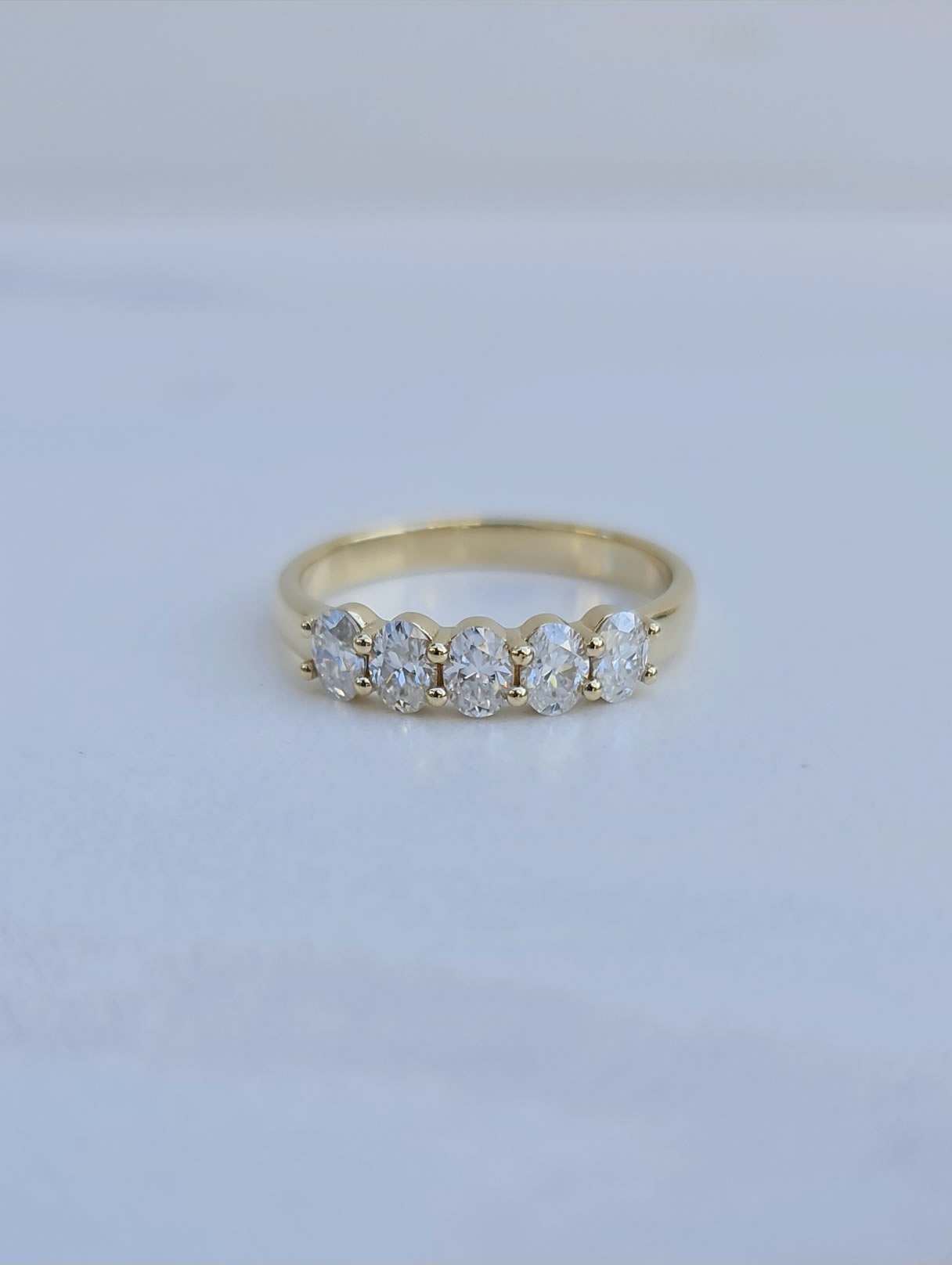 The ring has 5x 4mm by 3mm oval moissanites set on a of solid 9ct yellow gold 2.6mm band.